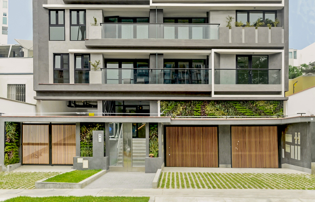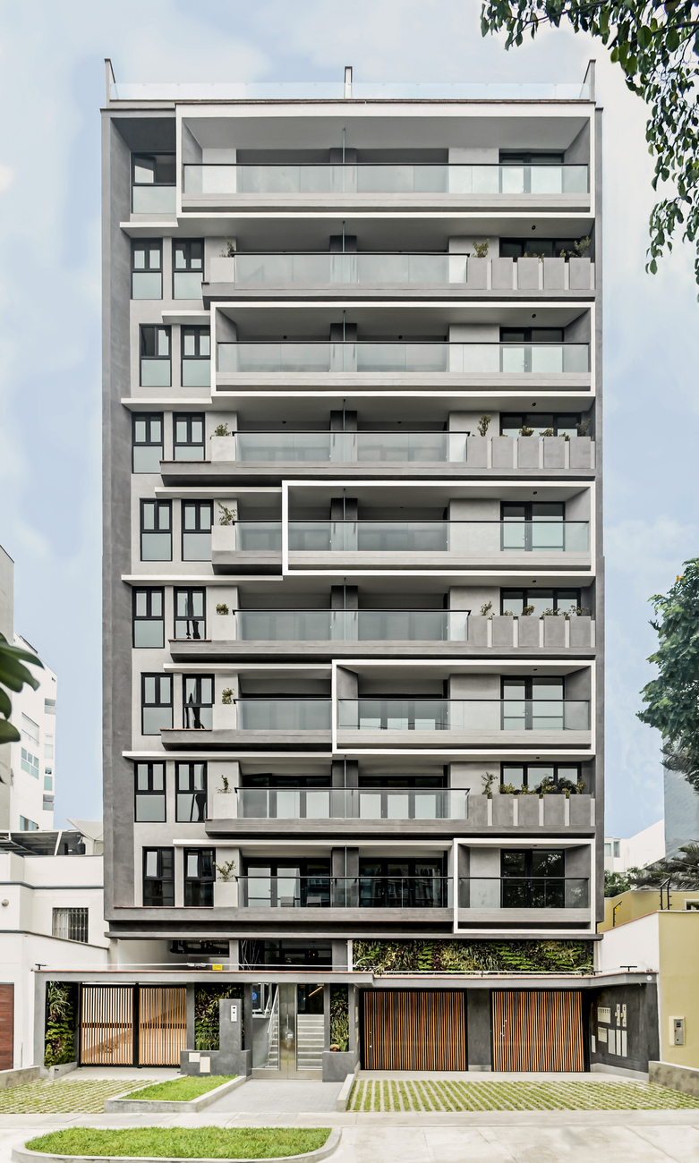 • 30 departamentos y estacionamientos para 64 autos, desarrollados en 10 pisos más azotea, 01 semisótano y 02 sótanos